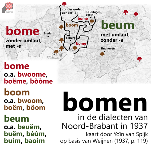 Het Oost-Brabants onderdeel van een gigantisch gebied waar de meervoudsklinker verandert. In het Limburgs hoor je bijvoorbeeld boum met in het meervoud buim, en in het Twents boom met beume. Dat gebied houdt niet op bij de grens: in het Duits is het Baum en Bäume.